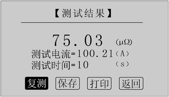 讀取測(cè)試結(jié)果,正在測(cè)試時(shí),系統(tǒng)顯示“停止”,“返回”項(xiàng)。點(diǎn)擊“停止”,系統(tǒng)停止計(jì)時(shí),電流停止輸出。點(diǎn)擊“返回”,系統(tǒng)停止計(jì)時(shí),電流停止輸出并返回上一界面。注意:開始測(cè)試的前幾秒,由于電流沖擊和電容充電,測(cè)試結(jié)果不穩(wěn)定,5s后測(cè)試結(jié)果穩(wěn)定,用戶即可記錄數(shù)據(jù)。