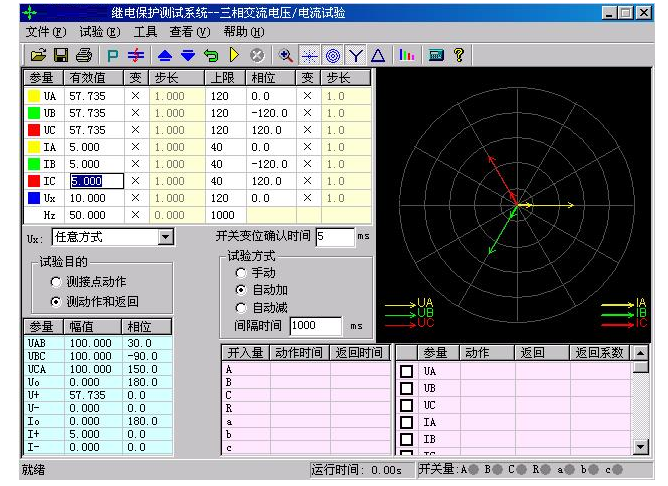 YTC1000微機繼電保護測試儀單欄中常用的菜單項,在各個測試模塊中其名稱或符號相同,定義的意義和功能也基本相同。這里以“交流試驗”模塊為例進行介紹,可以適用于后面介紹的各個功能模塊。界面如下圖所示: