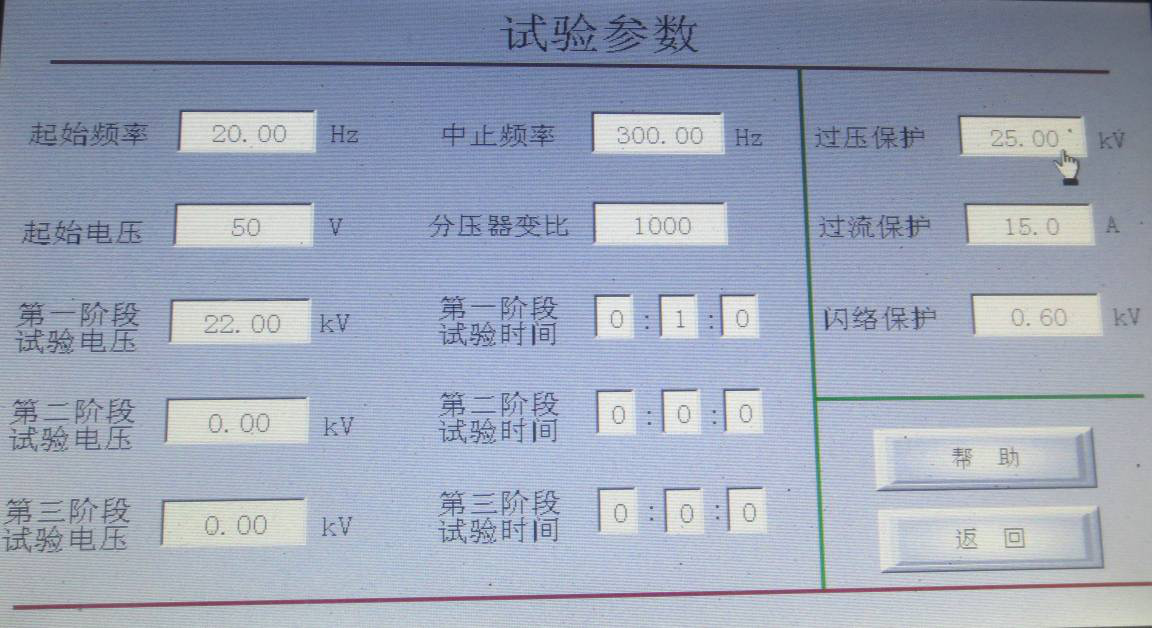 第一階段試驗(yàn)電壓:設(shè)置試驗(yàn)電壓的第一階段值。