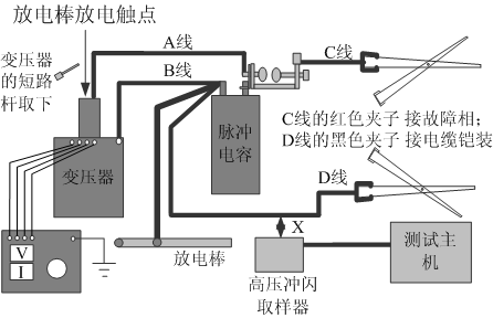 步驟6:用高壓沖閃線連接主機信號接口和高壓沖閃取樣器。高壓沖閃取樣器要盡量靠近上圖中的“D”連接線,這樣更容易接收故障信號。