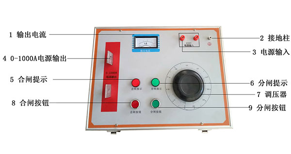 大電流發(fā)生器屬于JT型活動(dòng)結(jié)構(gòu),紅色指示燈表示工作信號(hào)。操作面板由啟動(dòng)按鈕(綠色)、停止按鈕(紅色)和工作系統(tǒng)組成。
