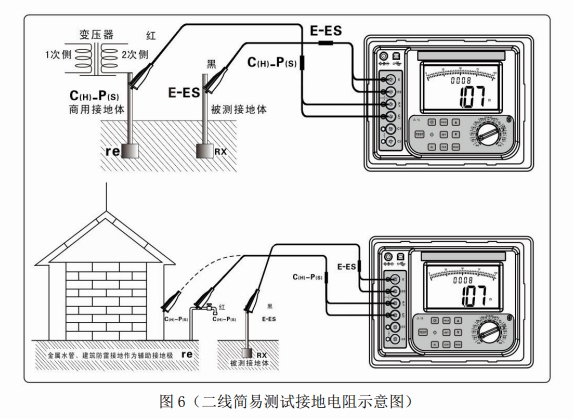 二線法測(cè)試:此方法是不使用輔助接地棒的簡(jiǎn)易測(cè)量法,利用現(xiàn)有的接地電阻值最小的接地極作為輔助接地極,使用 2 條簡(jiǎn)易測(cè)試線連接(即C(H)-P(S)接口短接、E-ES 接口短接)??梢岳媒饘偎?、消防栓等金屬埋設(shè)物、商用電力系統(tǒng)的共同接地或建筑物的防雷接地極等來代替輔助接地棒C(H)、P(S),測(cè)量時(shí)注意去除所選金屬輔助接地體連接點(diǎn)的氧化層。接線如下圖。