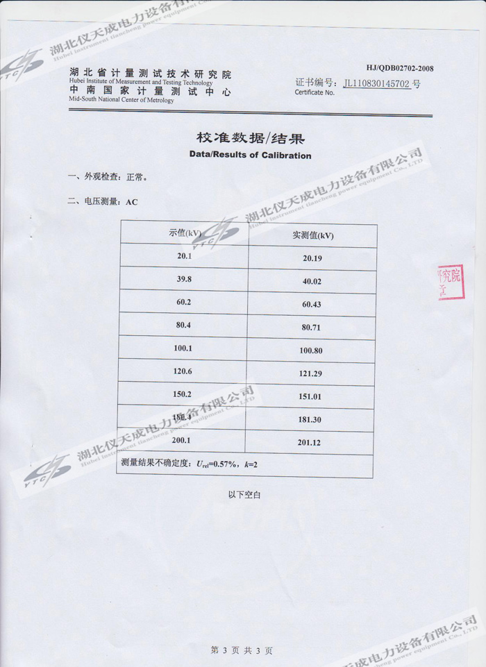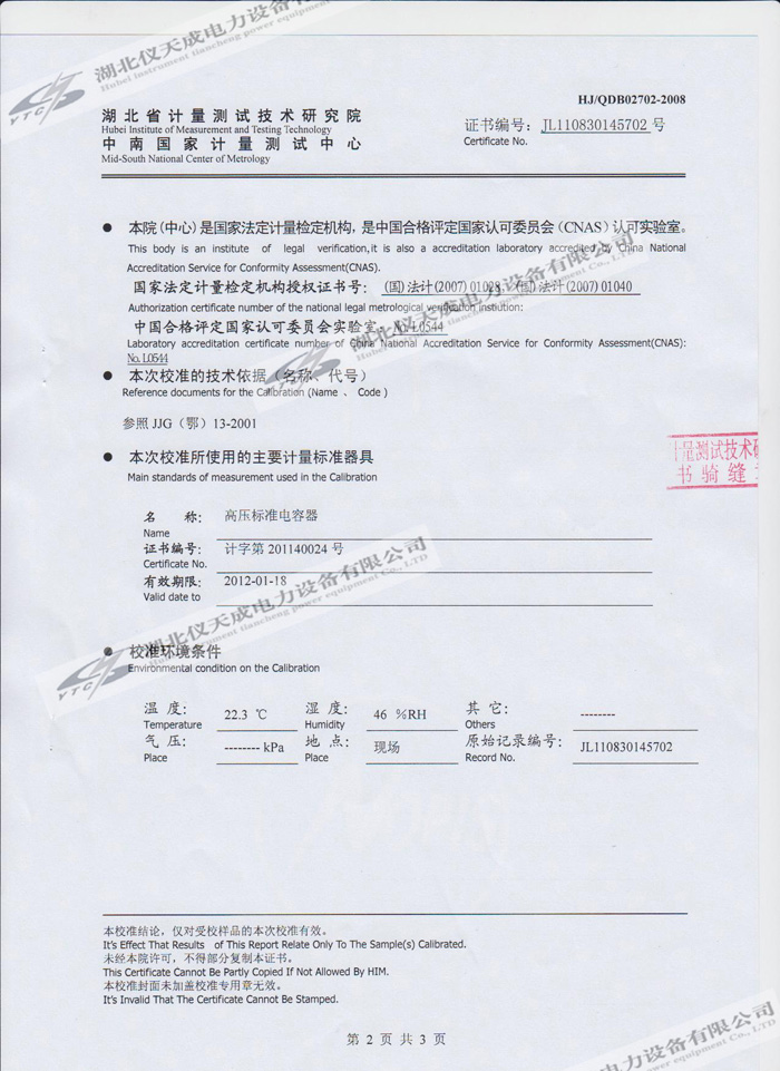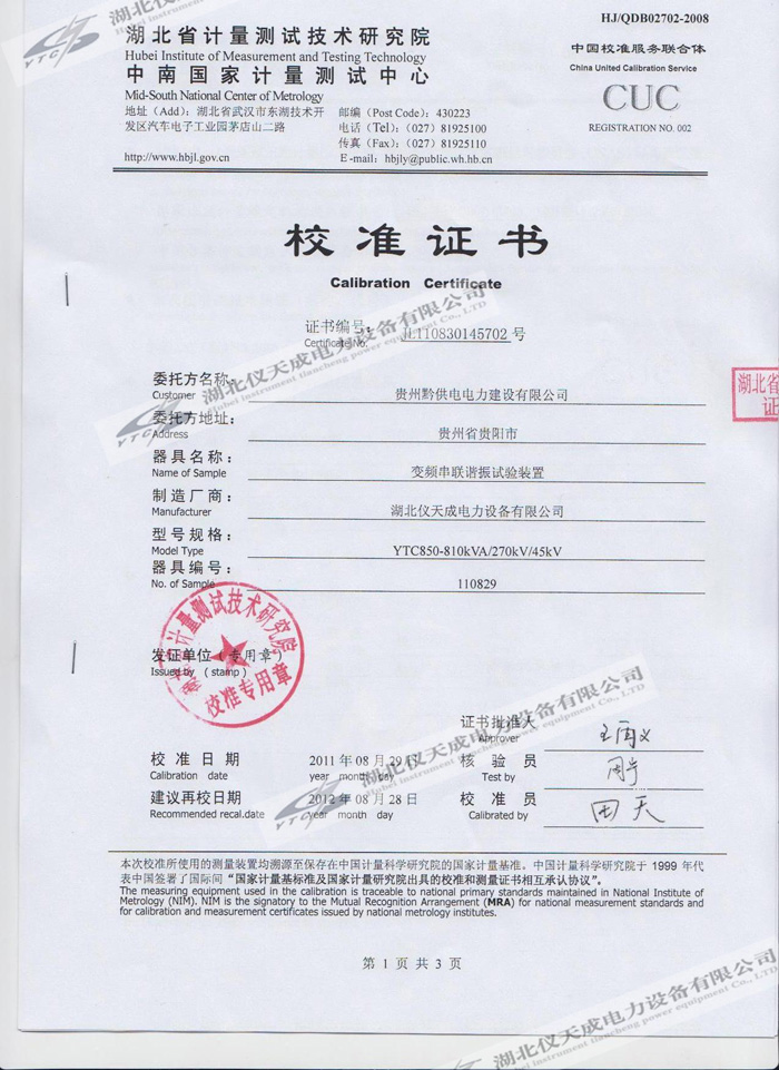 轉載:"YTC850-810kVA/270kV/45kV變頻串聯諧振試驗裝置的資質證書" 請注明來源于儀天成電力。 更多技術問題請致電儀天成電力客戶服務:027-87876585,技術部專線:027-87876585,在線客服:719388481