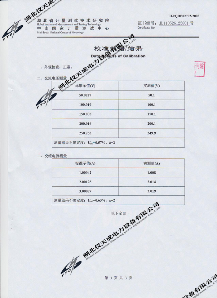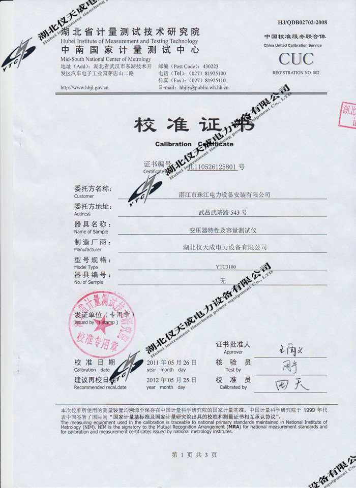 轉(zhuǎn)載:"YTC3100變壓器特性及容量測(cè)試儀的資質(zhì)證書(shū)" 請(qǐng)注明來(lái)源于儀天成電力。 更多技術(shù)問(wèn)題請(qǐng)致電儀天成電力客戶服務(wù):027-87876585,技術(shù)部專(zhuān)線:027-87876585,在線客服:719388481