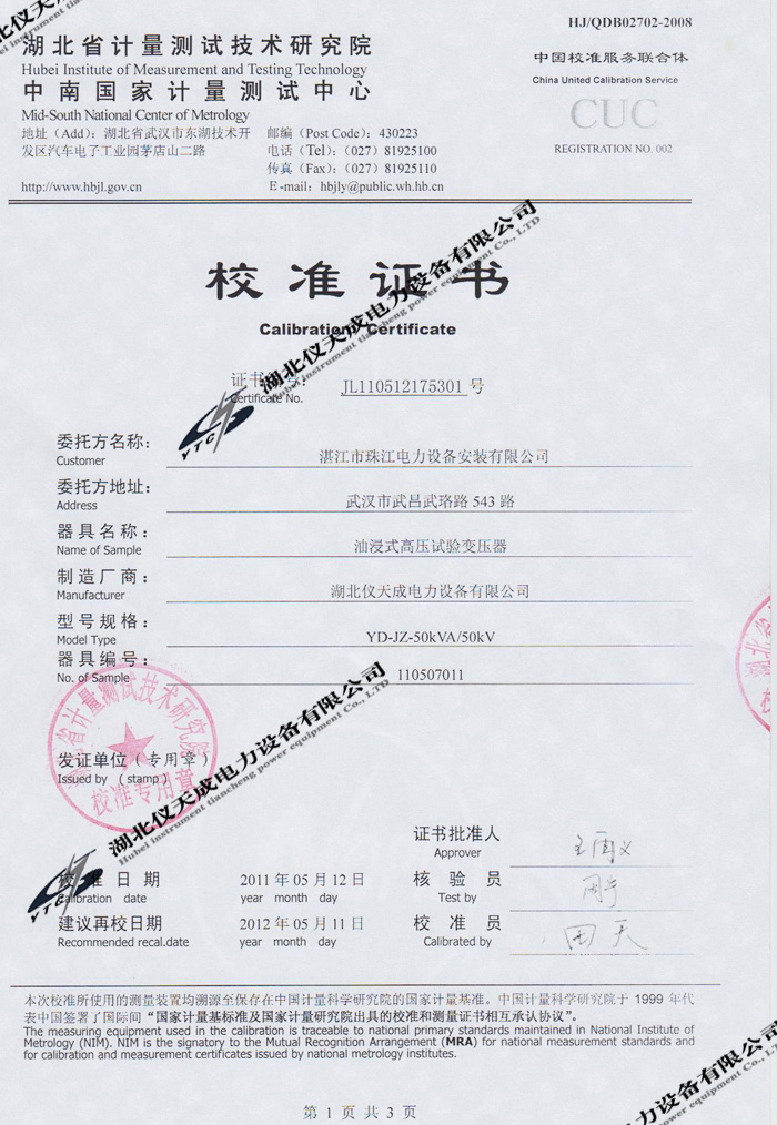轉(zhuǎn)載:"YD-JZ-50kVA/50kV油浸式試驗變壓器的資質(zhì)證書" 請注明來源于儀天成電力。 更多技術(shù)問題請致電儀天成電力客戶服務(wù):027-87876585,技術(shù)部專線:027-87876585,在線客服:719388481