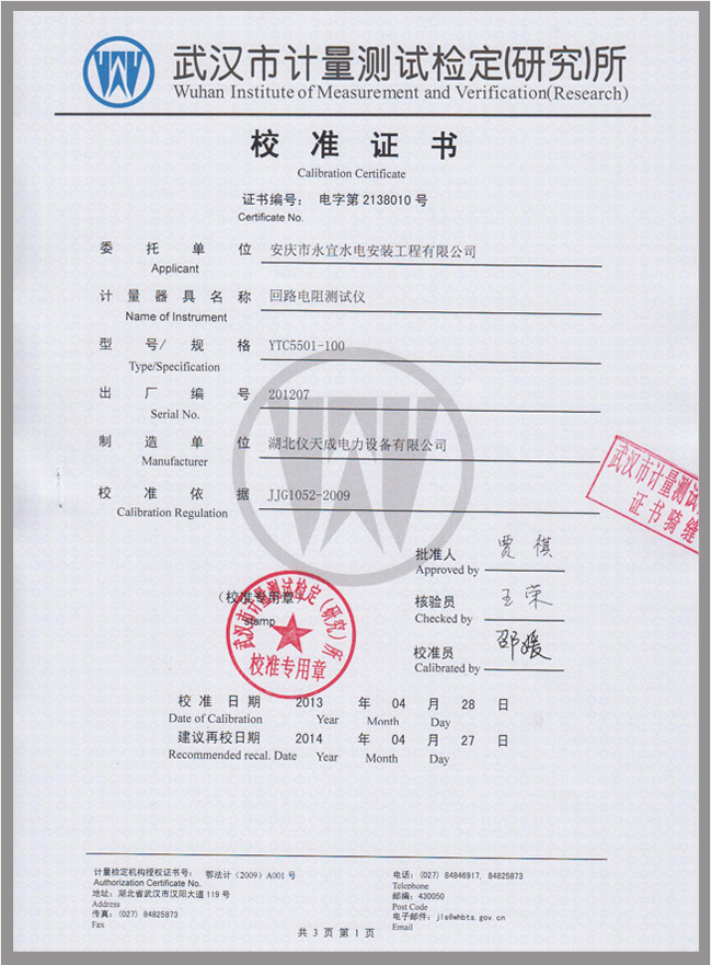 轉載:"YTC5501回路電阻測試儀鑒定證書" 請注明來源于儀天成電力。 更多技術問題請致電儀天成電力客戶服務:027-87876585,技術部專線:027-87876585,在線客服:719388481